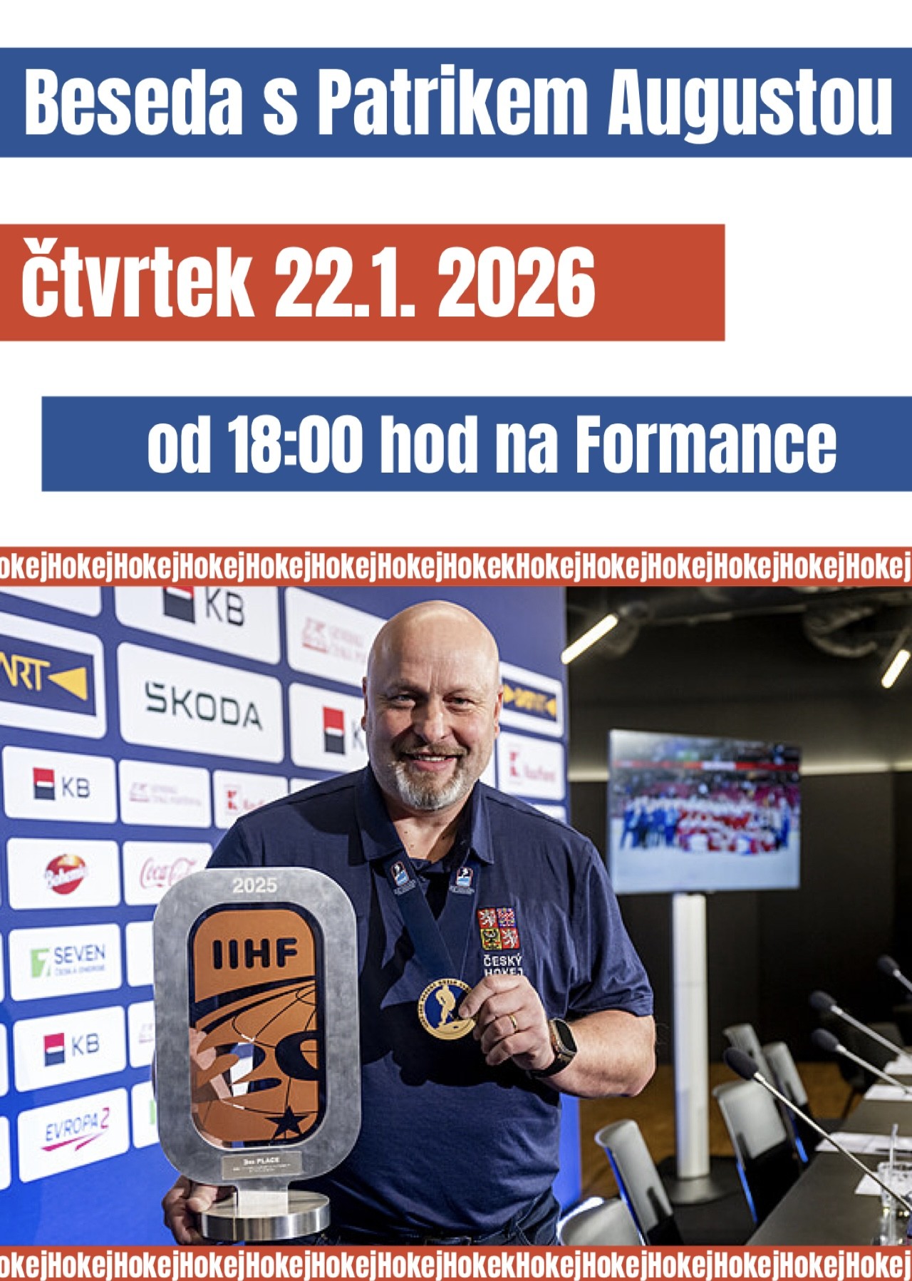 Přijďte si poslechnout zajímavé vyprávění o cestě za úspěchem, práci s mladými hokejisty, zákulisí reprezentačního týmu i osobní zkušenosti z vrcholového sportu. Součástí besedy bude prostor pro dotazy diváků, tak budeme rádi, když si nějaké připravíte.