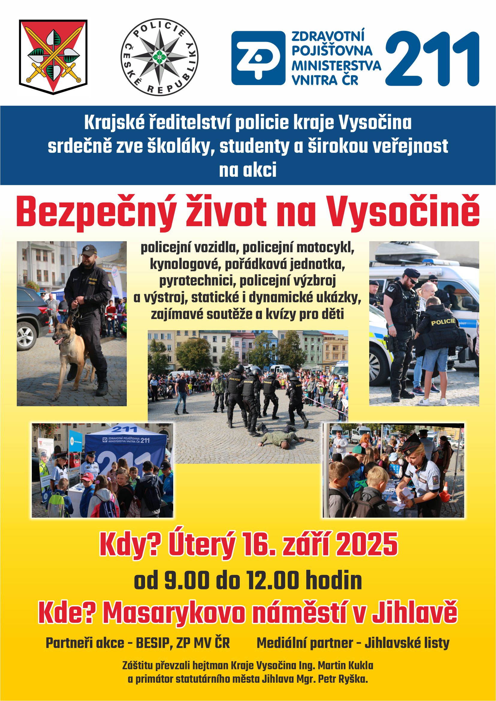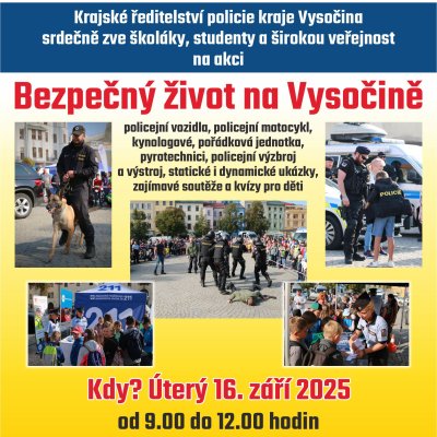 KRAJ VYSOČINA - Krajské ředitelství policie kraje Vysočina srdečně zve širokou veřejnost, především školáky a studenty z celého Jihlavska na jedinečnou akci s názvem „Bezpečný život na Vysočině“, která se uskuteční v úterý 16. září 2025 v Jihlavě. Program dopolední části bude probíhat od 9:00 do 12:00 hodin na Masarykově náměstí v Jihlavě a nabídne atraktivní pohled do světa policejní práce a techniky.