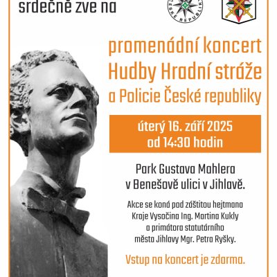 Po dopolední části zveme veřejnost k odpolednímu pokračování programu. Od 14:30 hodin se v Parku Gustava Mahlera na Benešově ulici v Jihlavě uskuteční promenádní koncert Hudby Hradní stráže a Policie České republiky. Tento koncert je přístupný široké veřejnosti a vstup na něj je zdarma.