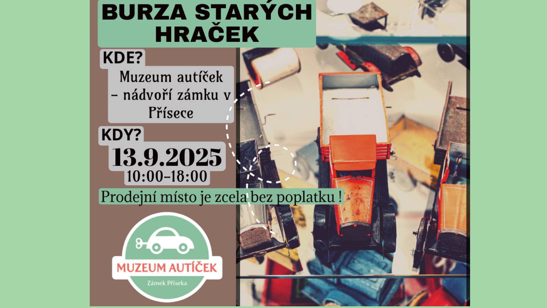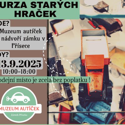Během akce budete mít jedinečnou možnost navštívit Muzeum autíček a prohlédnout si, jak může vypadat taková unikátní sbírka historických modelů autíček a hraček. Vlastní stolky anebo deky a prostěradla pro vymezení vašeho prodejního místa vezměte sebou! Kreativitě se u nás meze nekladou. V případě nepříznivého počasí se burza přesouvá do prostor muzejní kavárny.