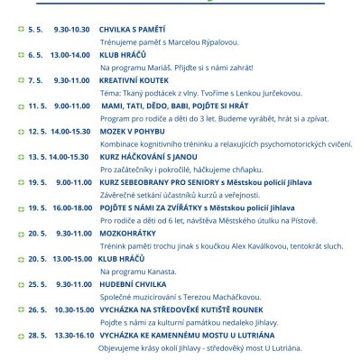 Dozvíte se, co můžete udělat pro svoji skvělou paměť právě tady a právě teď. Povíme si triky, které fungují, ukážeme si cviky, které paměti prospívají a vyzkoušíme si hry, které paměť baví. Tak nezapomeňte přijít, těšíme se na Vás!