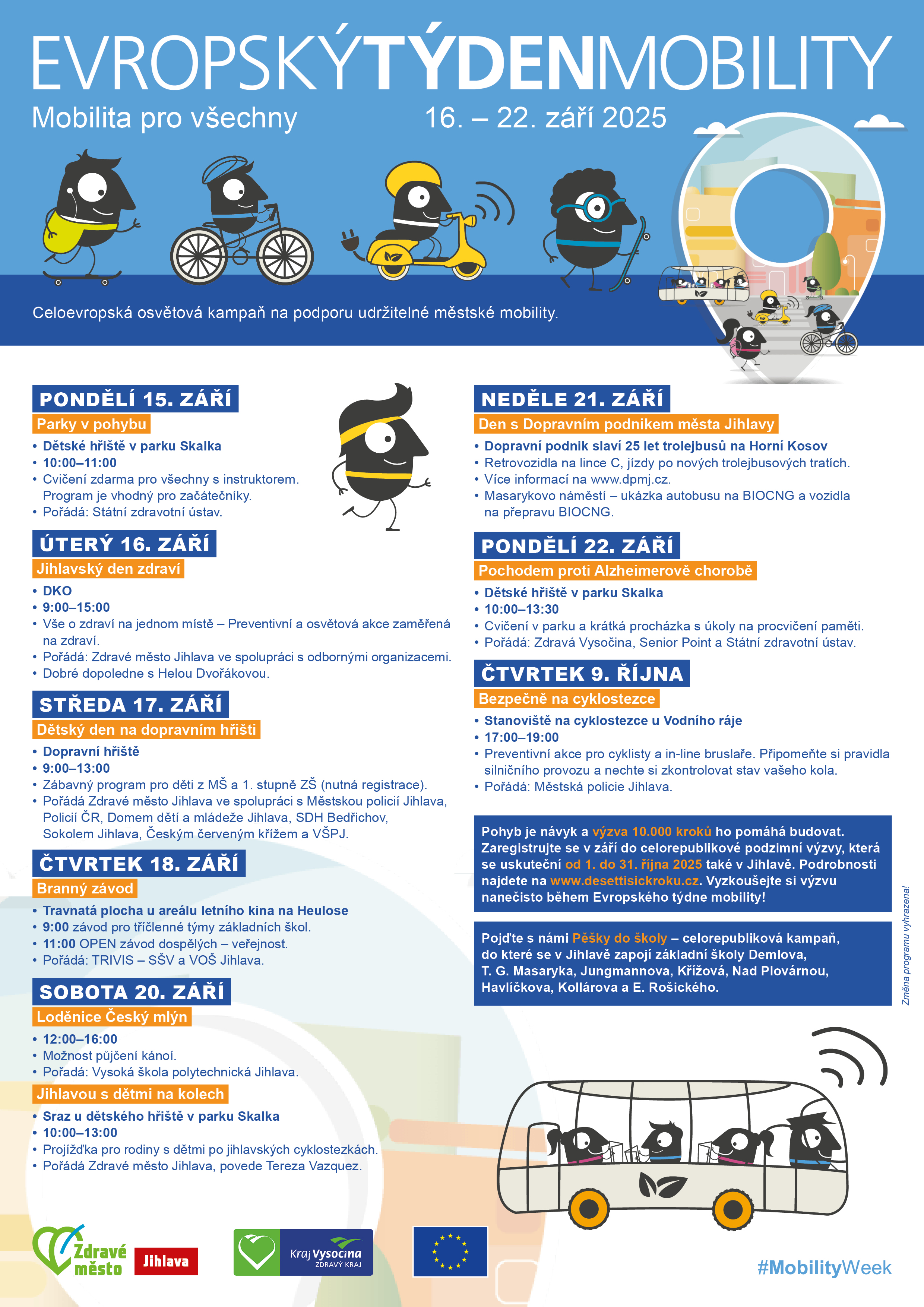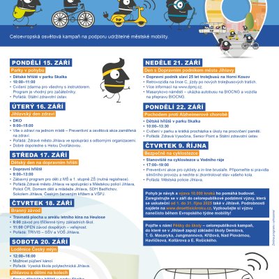 EVROPSKÝ TÝDEN MOBILITY (ETM) je vlajková kampaň Evropské komise, která se každoročně koná v termínu 16.–22. září. Cílem je zvýšit povědomí občanů o udržitelné mobilitě, upozornit na problémy v dopravě a hledat řešení šetrná ke klimatu a životnímu prostředí. ETM je ideální příležitostí pro obyvatele cíleně vyzkoušet alternativní způsoby dopravy a užít si výsady městského prostředí bez automobilů.
