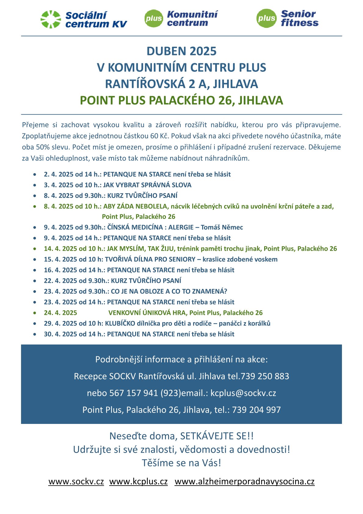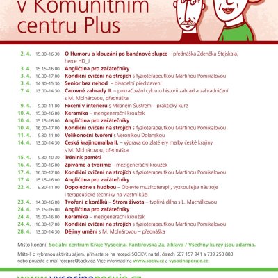 Máte-li o vybranou aktivitu zájem, přihlaste se na recepci SOCKV, na tel. čísle 567 157 923 nebo použijte e-mail recepce@sockv.cz.Více informací o akcích se dozvíte na www.sockv.cz a vysocinapecuje.cz