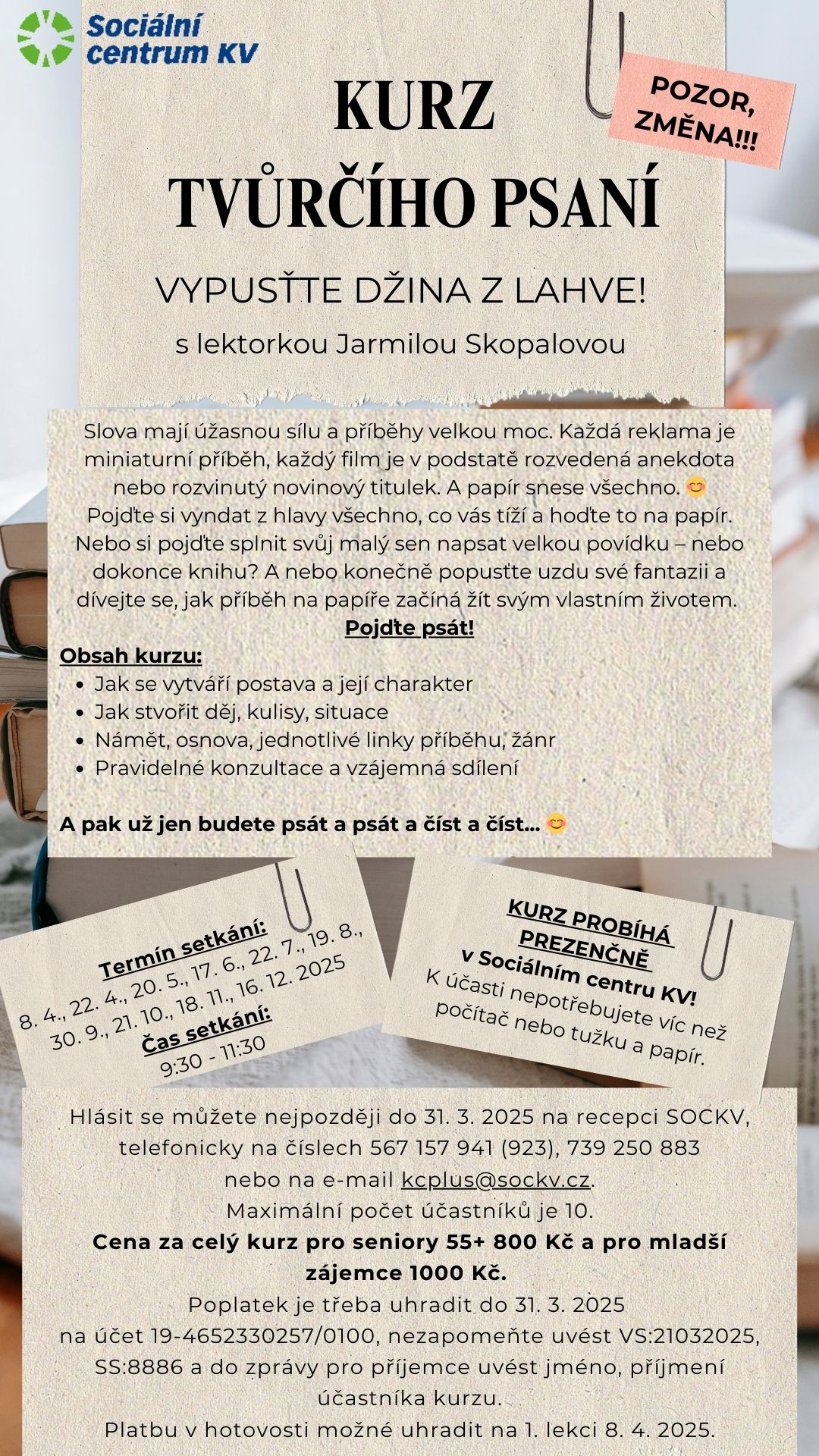 Cena kurzu: 10 setkání – 1 000,- Kč pro veřejnost, 800,- Kč pro Seniory 55+
