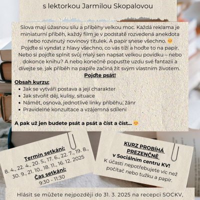 Pojďte si vyndat z hlavy všechno, co vás tíží a hoďte to na papír. Nebo si pojďte splnit svůj malý sen napsat velkou povídku – nebo dokonce knihu? Anebo konečně popusťte uzdu své fantazii a dívejte se, jak příběh na papíře začíná žít svým vlastním životem. Pojďte psát!