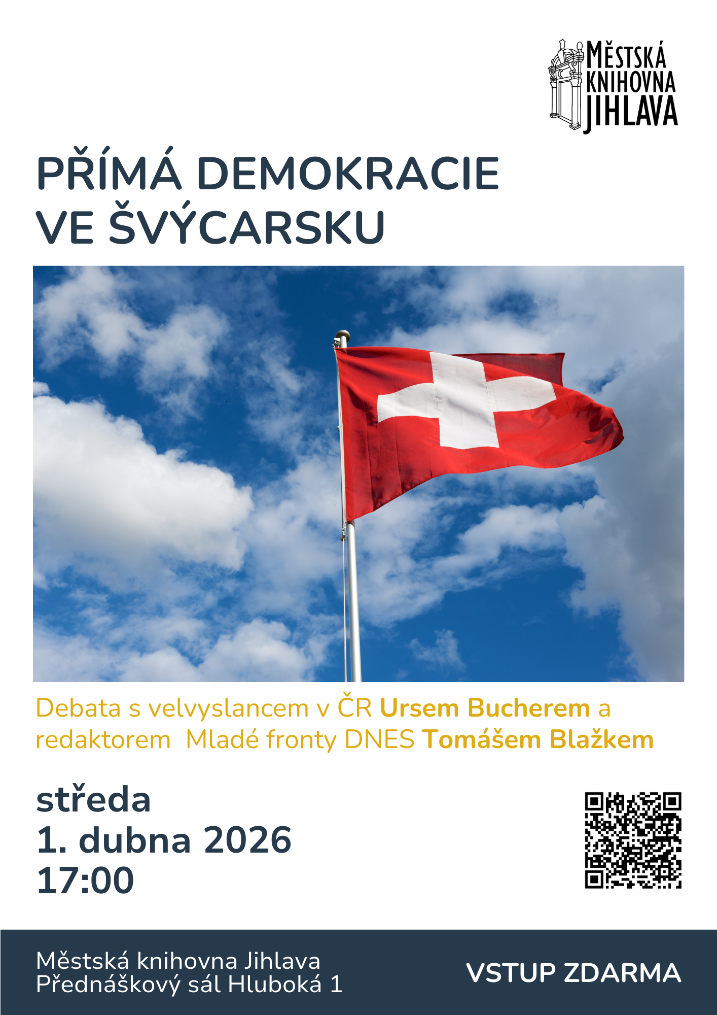 Nejen o tom, ale také o Švýcarsku jako zemi v České republice v mnohém blízké i vzdálené, přijde do jihlavské městské knihovny debatovat velvyslanec Švýcarské konfederace v České Republice pan Urs Bucher, a spolu s ním i redaktor jihlavské Mladé fronty Dnes pan Tomáš Blažek. Moderuje Lubomír Sůva, akce bude tlumočena do češtiny.