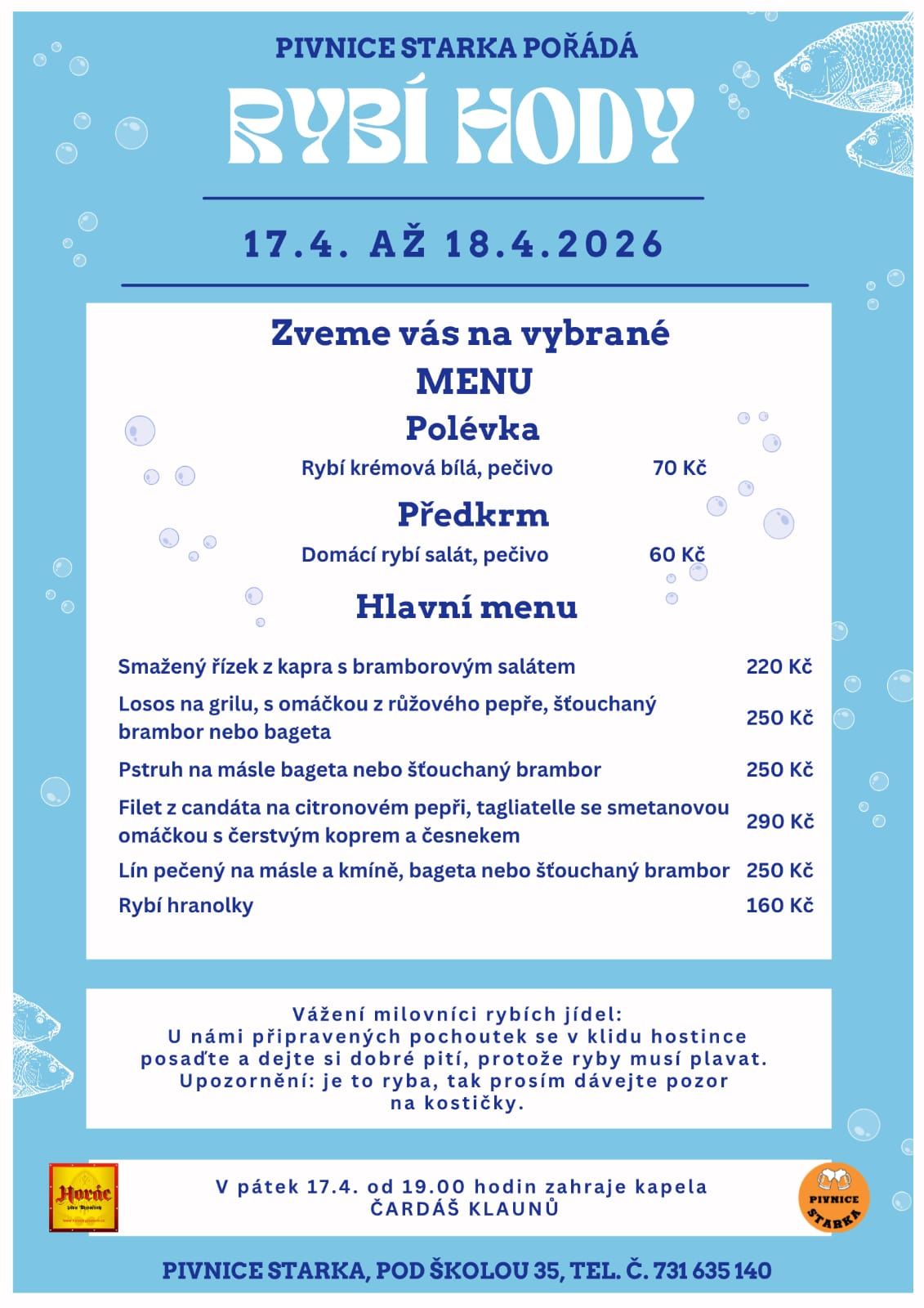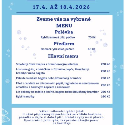 Chystáme pro vás další víkend plný jídla. Tentokrát to budou RYBÍ HODY. V pátek nám k tomu zahraje od 19.00 ČARDÁŠ KLAUNŮ a GRAMY.