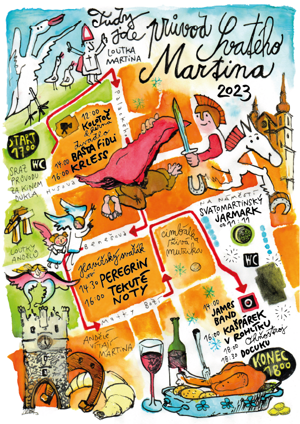 Oslava svatého Martina v Jihlavě se letos opět koná na vícero místech. Kromě svatomartinského jarmarku, který bude přes den probíhat na Masarykově náměstí, chystá Brána Jihlavy, p.o., doprovodný program v ulicích města na trase průvodu. V parku Jana Masaryka za kinem Dukla bude kolotoč, herna, divadlo a středověký koncert, v ulici Věžní se můžete k havířskému svařáku těšit na kapely pro zpříjemnění čekání na příjezd svatého Martina.