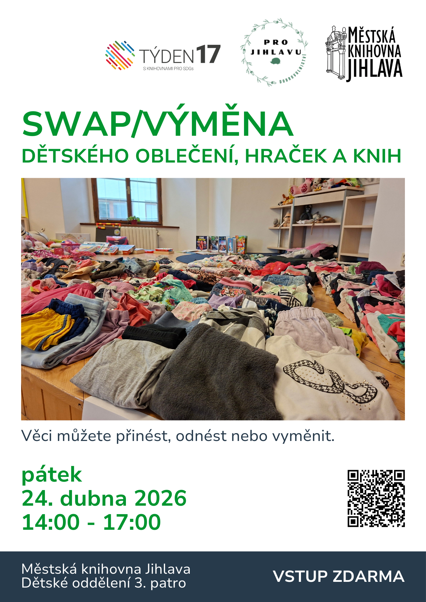 Dětské věci můžete přinést, ale není to podmínkou, na dětské oddělení v den swapu. Vše od vás převezmou knihovnice a dobrovolnice a oblečení roztřídí podle velikostí.
