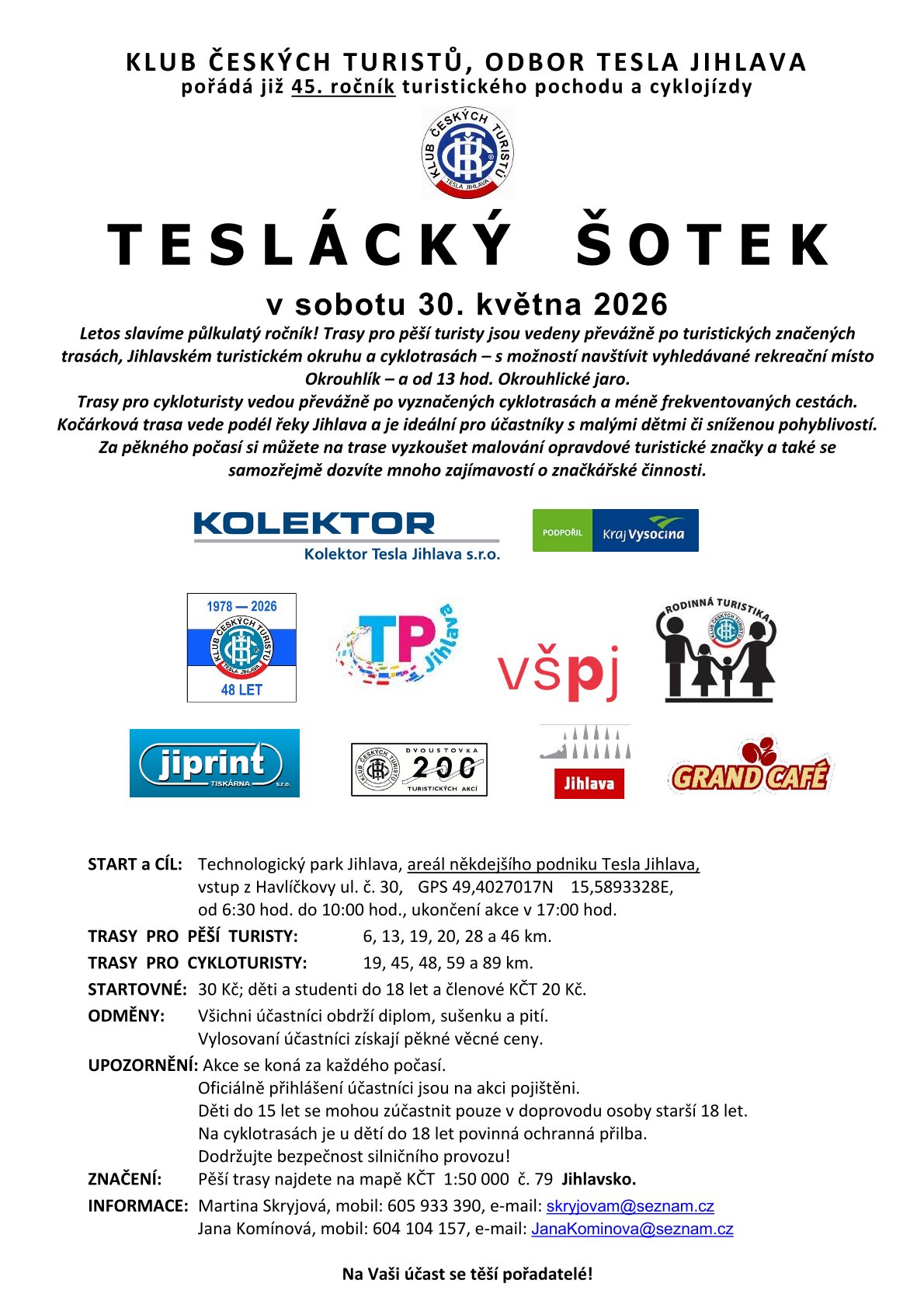 Letos slavíme půlkulatý ročník! Trasy pro pěší turisty jsou vedeny převážně po turistických značených trasách, Jihlavském turistickém okruhu a cyklotrasách – s možností navštívit vyhledávané rekreační místo