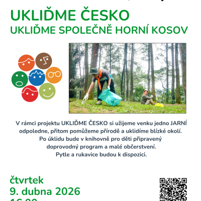 V rámci projektu Ukliďme Česko si společně užijeme jedno jarní odpoledne venku — a zároveň pomůžeme přírodě úklidem blízké okolí. Po úklidu bude v knihovně pro děti připraven doprovodný program a drobné občerstvení.