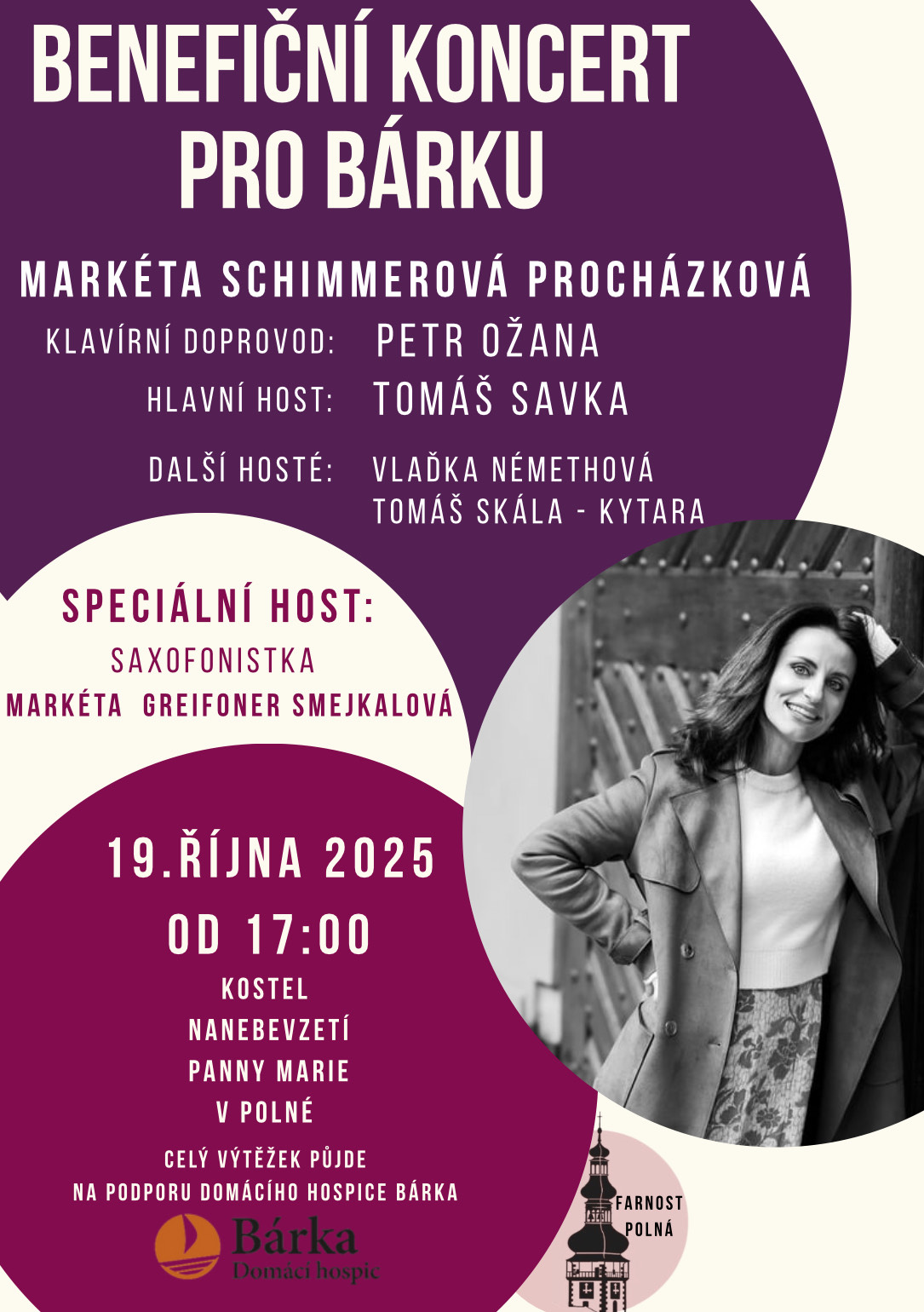 Farnost Polná zve na benefiční koncert zpěvačky Markéty Schimmerové Procházkové, který je věnován na podporu služby nevyléčitelně nemocným Bárka – domácí hospic při Oblastní charitě Jihlava. Koncert se koná v neděli 19. 10. 2023 od 17 hodin v kostele Nanebevzetí Panny Marie v Polné. Vstupné je dobrovolné.