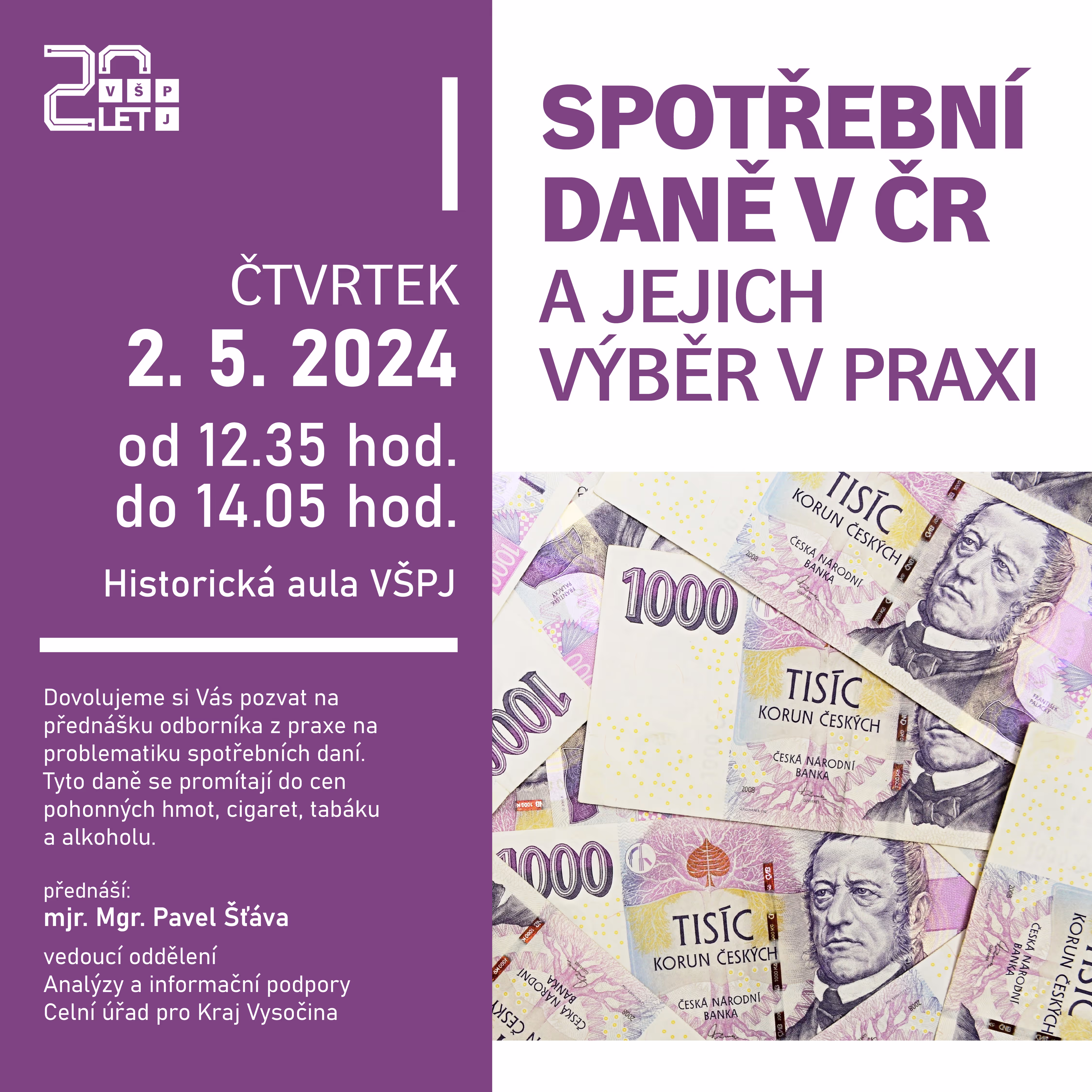 Dovolujeme si Vás pozvat na přednášku odborníka z praxe o problematice spotřebních daní, která se uskuteční 2. května 2024 na VŠPJ. Tyto daně se promítají do cen pohonných hmot, cigaret, tabáku a alkoholu.
