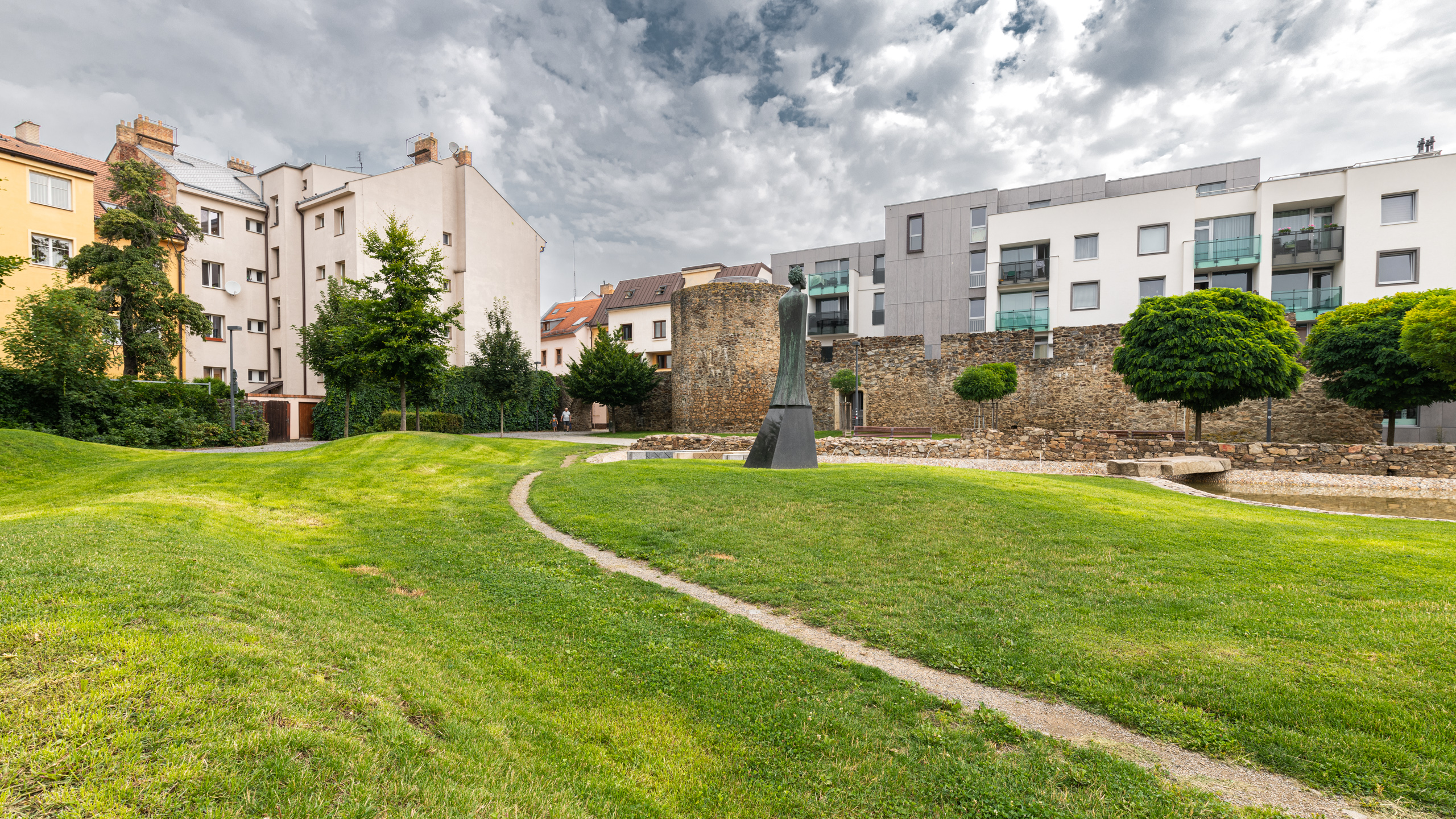 Architektonická kompozice parku je pojata jako kontrast krajiny s městem. Voda a zvlněné travnaté plochy vedle ostře tvarovaných forem a kamenných prvků se tu potkávají s historií místa – s plochou hradebního parkánu, linií městských hradeb a odkrytými základy vypálené synagogy. Pohled shora nabízí vyhlídka v historické baště opevnění.